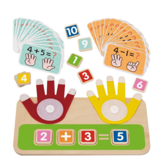 Deixe seu filho explorar o mundo da matemática de forma amigável e envolvente! Um brinquedo de madeira com mãos móveis e blocos coloridos é um excelente auxílio educacional que apoia o desenvolvimento do pensamento lógico e ensina o básico de adição e subtração através da brincadeira. Características: - Base de madeira com duas mãos móveis (vermelha e amarela) imitando a contagem nos dedos - Lugares para inserir blocos com números e sinais de operações matemáticas - Elementos em cores vivas e adequadas para crianças - Construção em madeira resistente garante a durabilidade do brinquedo - Dedos feitos de feltro – graças ao Velcro nas pontas, podem ser facilmente dobrados, o que facilita a contagem.